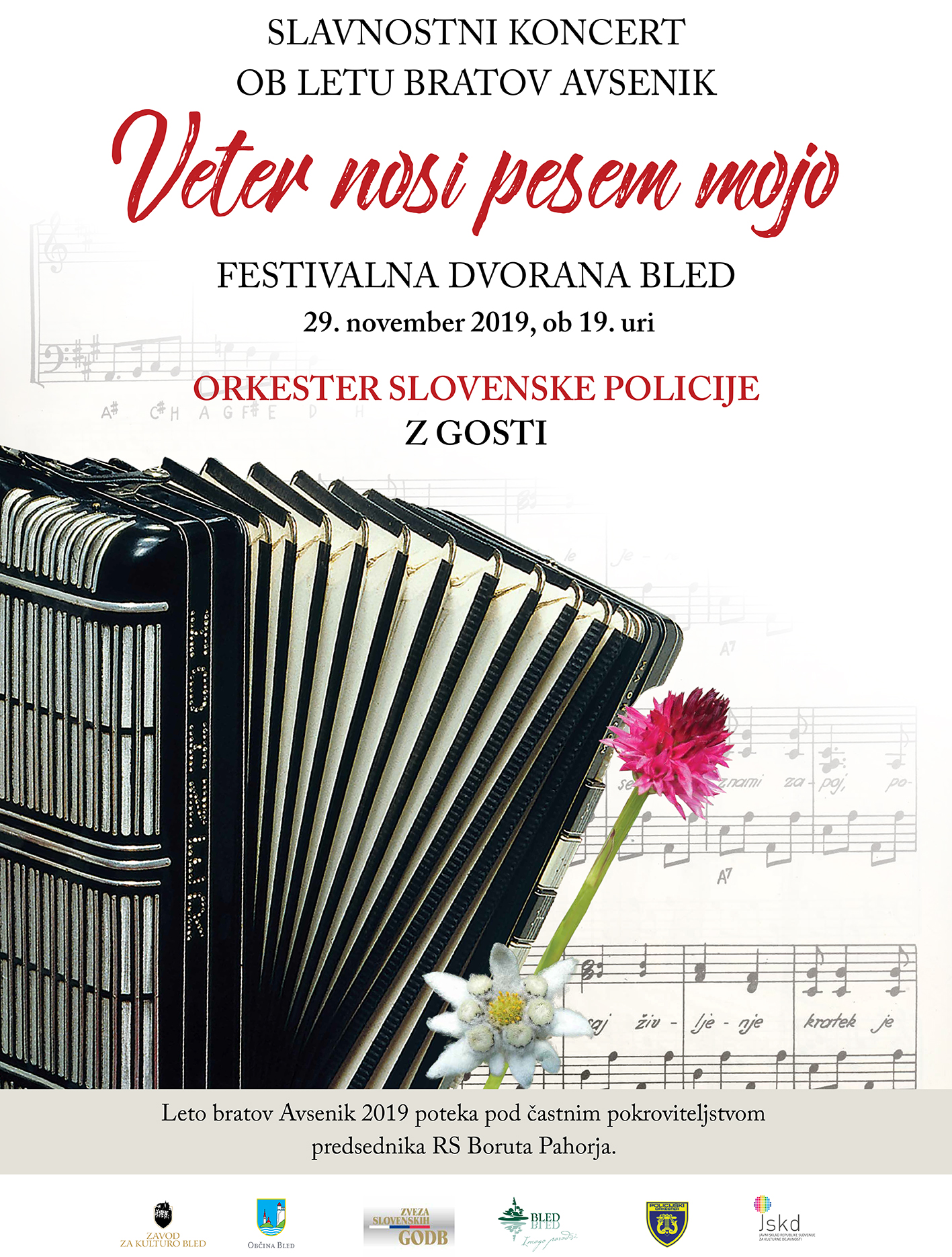 Ob zaključku leta, ki se je pričel 9. 11. 2018 in je trajal do 31. 12. 2019, smo v petek, 29. novembra 2019 v Festivalni dvorani na Bledu izvedli tudi zaključni slavnostni koncert s Orkestrom slovenske policije, ki nastopil je z solisti iz družine Avsenik in pod taktirko Nejca Bečana. Na koncertu smo slišali zadnji deli bratov Avsenik, napisanih za godbe ter priredbe znanih melodij. Solisti bodo Monika in Grega Avsenik, Simona Vodopivec, Franjo Maček in Matjaž Mrak. Leto bratov Avsenik poteka pod častnim pokroviteljstvom predsednika Republike Slovenije Boruta Pahorja, s čimer urad predsednika republike izkazuje podporo delu bratov Avsenik in slovenskemu godbeništvu.